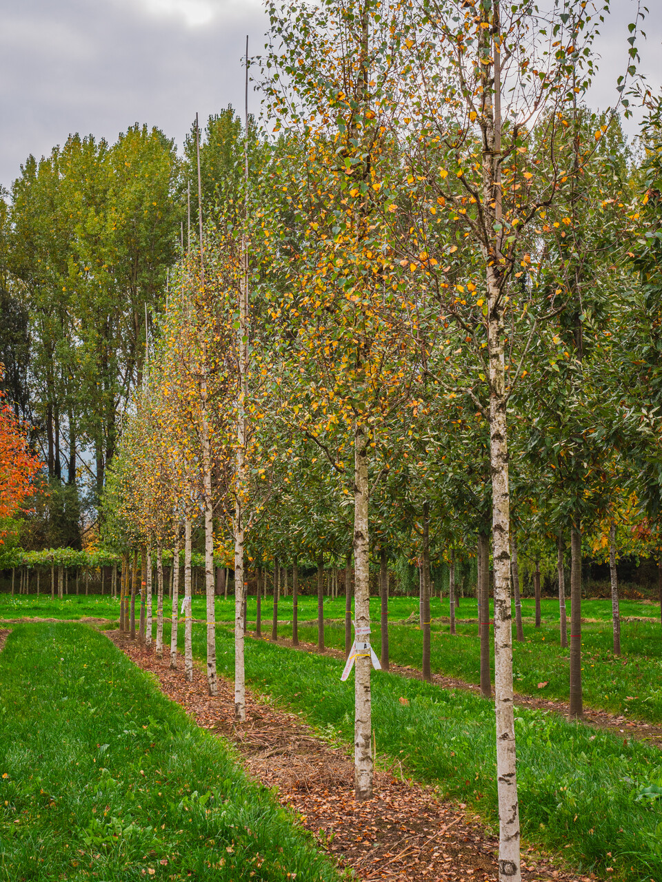Medium-size tree with healthy, vigorous growth: has a slender, narrowly pyramidal crown. First year twigs dark brown, older bark white to grey-white. The bark is only slightly peeling: only older trees acquire a grooved trunk base. Forms a nicely vertical main stem with the branches growing from the central leader at an angle of about 45°. The glossy, fresh green leaf turns golden yellow in autumn. Due to the narrowly pyramidal crown, good anchoring and fairly light side branches, the tree is highly suitable for avenues and streets. Also very useful in landscape planting. Was discovered in Switzerland by Sjef van Roessel and introduced after extensive testing.