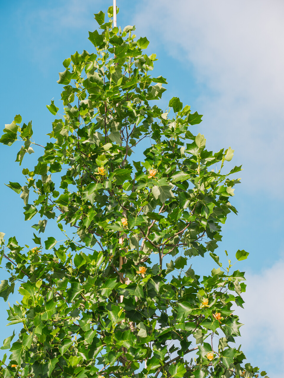 Fast-growing tree with a dead straight trunk. The crown is narrow early on but later develops to conical. In old specimens the branches spread to form a broad oval crown. The trunk is light grey to grey and develops shallow grooves with increasing age. The young twigs are greenish-grey, later reddish-brown. The leaves are 4-lobed and the top is straight to incised with a V. The underside is light green. In the autumn the leaves turn yellow. The tulip-shaped flowers appear after the leaves have emerged. They are approximately 4 cm long and 6 cm broad, have a green exterior and a yellow plus orange interior. The conical fruit consists of many winged nutlets pressed together in a spiral. Deep loose soil is required because of the deeply penetrating fleshy taproot. Liriodendron tulipifera forms a closed crown with vigorous foliage that turns a remarkable yellow in the autumn. Because of its rough branching the tree has an open silhouette in the winter.