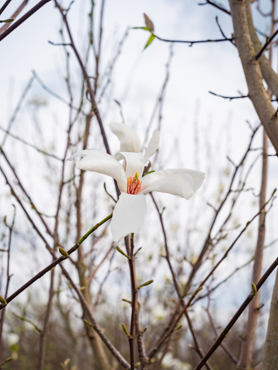 A medium sized tree with a crown that is upright pyramidal and closed at first. As the branches start to droop with age the crown eventually becomes spreading ovoid. Width circa 8 m. The smooth and bare branches have woolly-haired leaf buds. The leaf, which is short acuminate and obovate, turns yellow in autumn. Before the leaf appears this tree produces white, completely open flowers. These are circa 10 cm across. A late night frost may damage the flowers. At a young age M. kobus does not flower profusely, but when mature it is an abundantly flowering tree. Seedlings can take longer to come into flowering. After the flowers dark red receptacles appear. When ripening the pink-red seeds come out. The fleshy roots grow both shallow and deep.