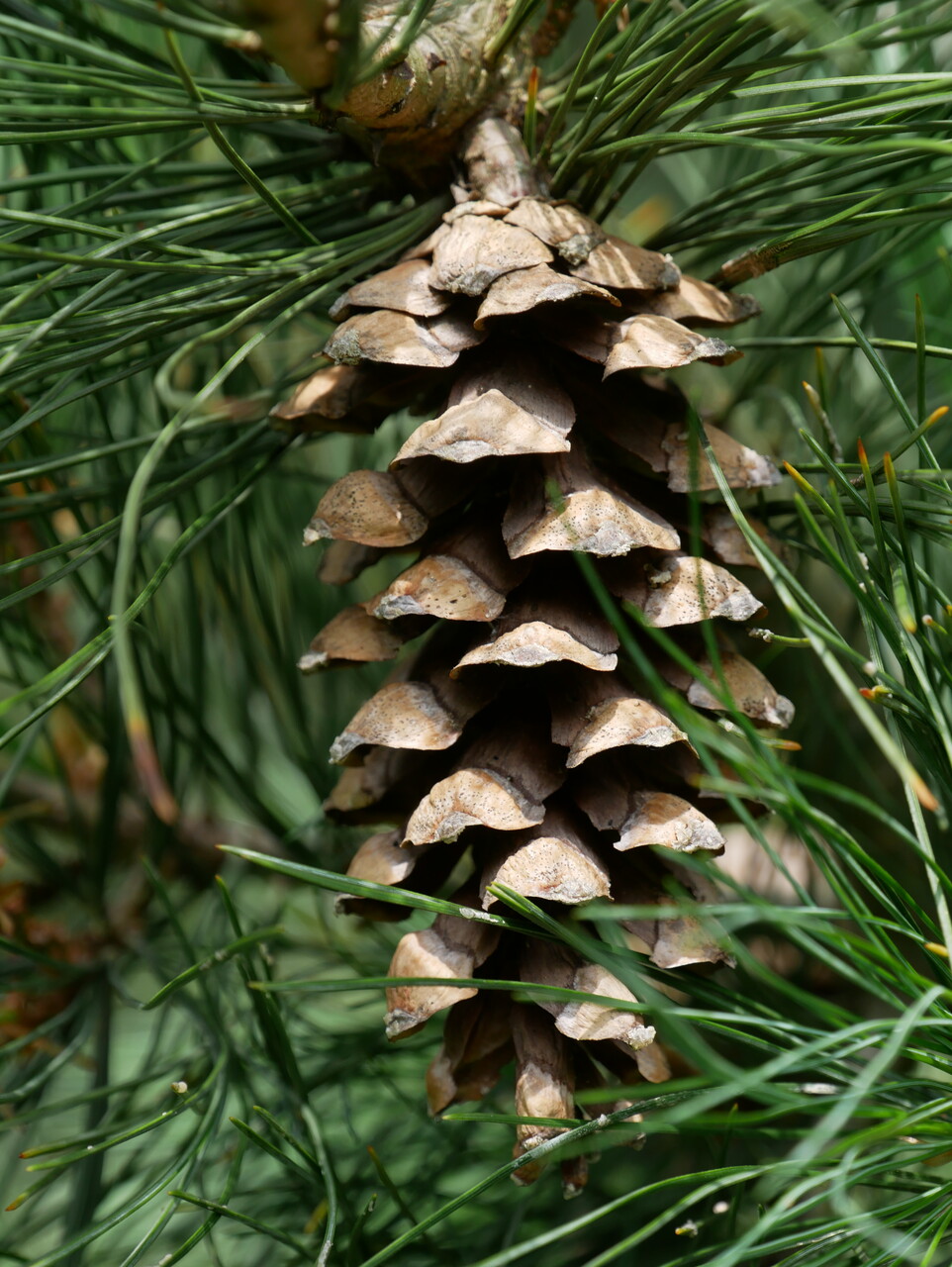 A quickly growing conifer with a narrow, vertical manner of growth, and a more horizontal branching pattern later. However, the lower branches will remain full if the tree has ample free space around it. Width 4.5 - 7 m. The pattern of growth is similar to P. cembra, but the needles of P. peuce are clearly different: less stiff and a greyish green. The smooth bark is greyish brown and later scales flake off. Young twigs are first shiny green, and later turn greyish brown. The greyish green, fairly thick needles grow in bundles of 5 together at the end of the twigs. These bundles are radially distributed over the twigs. The cylindrical cones spread out or hang down and are 8 - 15 cm long and 2 - 3 cm wide. They grow singly or in groups. Requires a sunny site and is not susceptible to woolly balsam aphid.