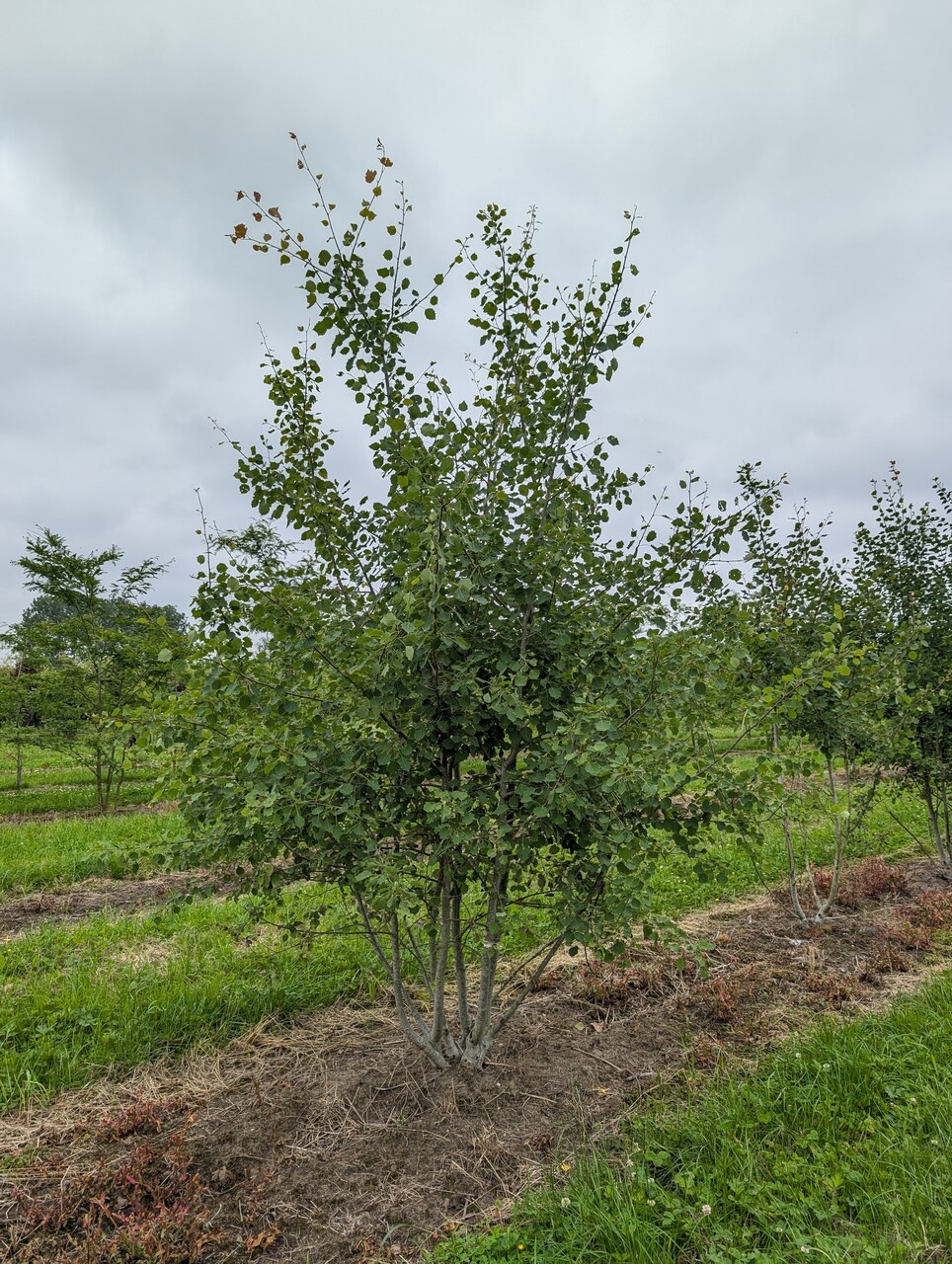 A large tree starting off with a spherical crown that later becomes more elongated oval to round. The bark is light grey and remains smooth for a long time: the young twigs are yellowish-brown and somewhat pendulous. The broad ovoid to round leaves are dark green with a lighter underside: the leaf edge is undulating to roughly serrated. In the autumn the leaves turn yellow. The rustling sound made by the leaves in the wind is characteristic. The tree is dioecious. Suitable for landscapes and row planting. P. tremula is valued in Eastern Europe and Scandinavia for its good wood for the matches and paper industries. Little sensitive to rust and leaf spot disease but this can vary from tree to tree. Stands up well to wind.