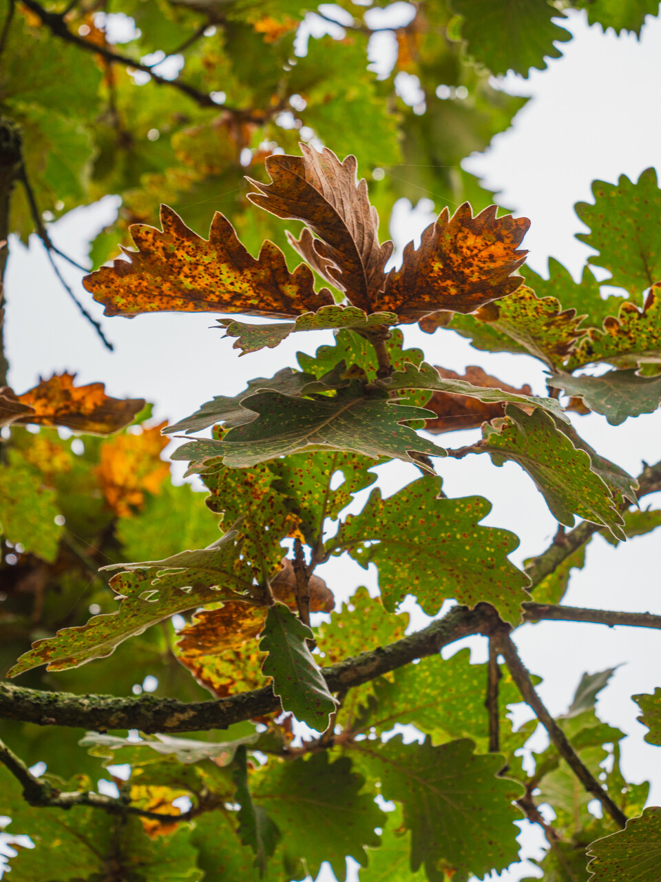 The leaves of Quercus dentata 'Carl Ferris Miller' turn sárga in autumn.