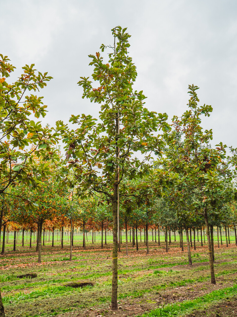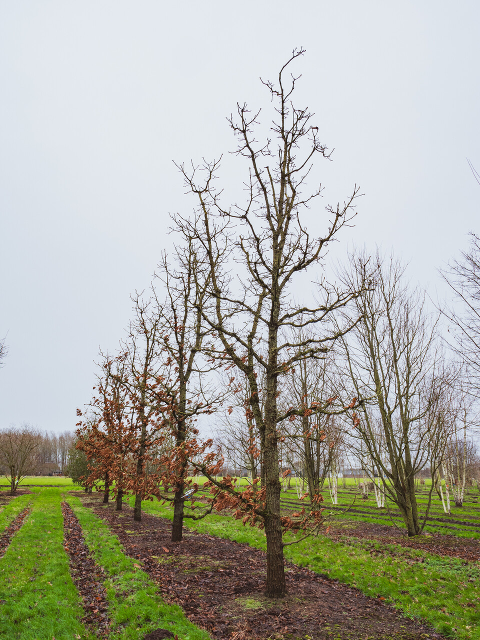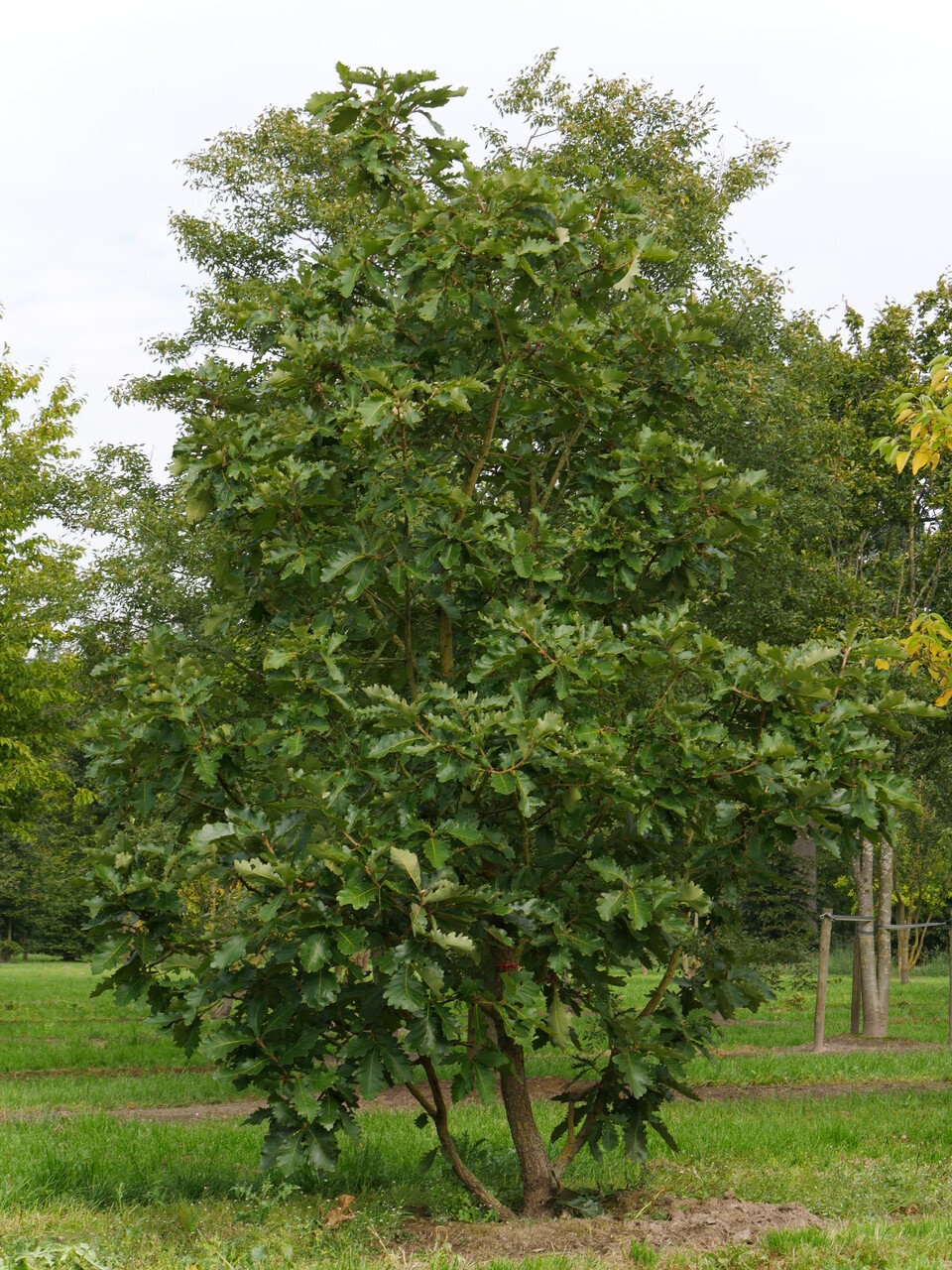 Medium-size tree with a regular crown growing to around 15 m. Has a good ascending growth habit and an upright central leader. When young, the crown is narrow but later it becomes broad oval to round. The grey bark is deeply grooved. Young twigs are strikingly thick and covered with dense downy hair. The large leaves are tough and leathery. The leaf is obovate, matt dark green and can reach 25 cm long and half as wide. It does not take on a nice autumn colour but the leaves remain on the tree all winter. The acorns are in small clusters. They are around 2 cm in size and about half enclosed by the cupule. This cultivar was selected by the De Belders on their estate, Hemelrijk, in Belgium from seeds that Carl Ferris Miller had collected when visiting Korea. Miller was an American who founded the Chollipo Arboretum in South Korea. A lovely park tree.