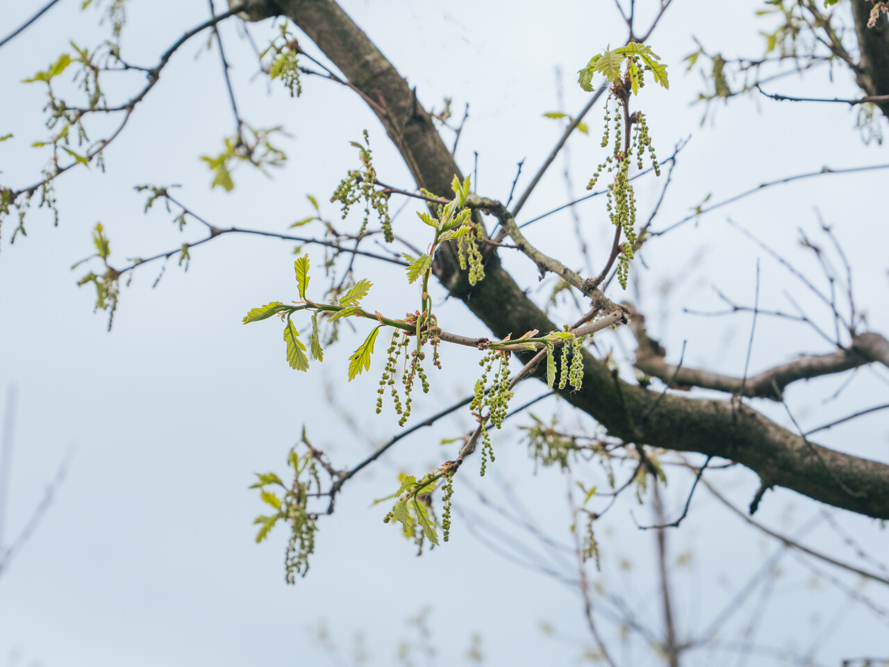 Quercus ×macdanielii HERITAGE ('Clemons') blooms in május.