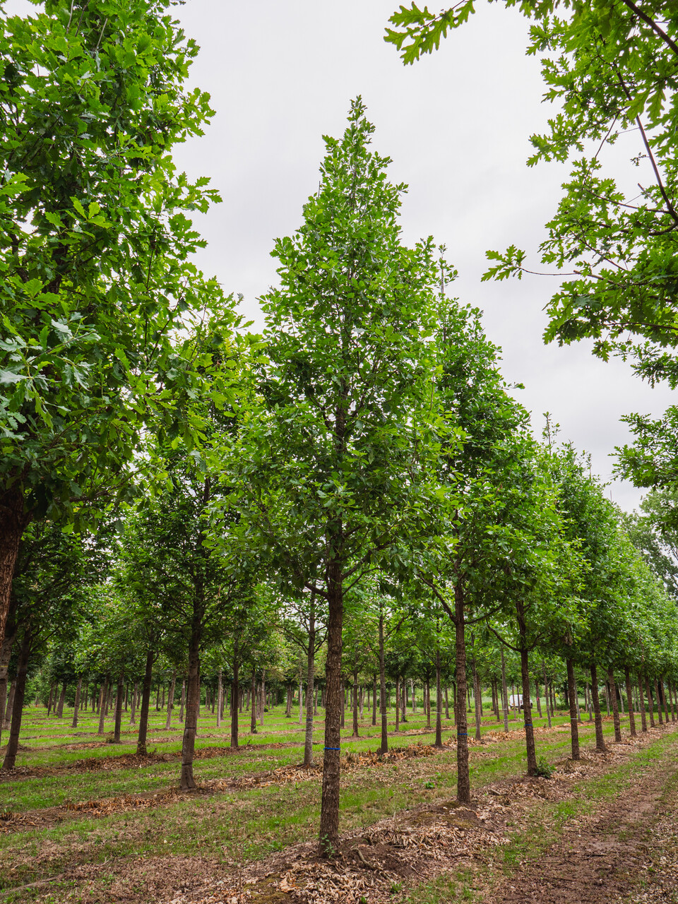 Hybrid between Q. macrocarpa and Q. robur which was found as a spontaneous seedling. It is a relatively vigorous large tree with a broad pyramidal crown. Eventually the tree can grow to over 20 m tall with a spread of around 15 m. Hardly any or no cork is produced on older twigs and bark: the bark’s grooves form rectangular plates. The obovate to elongated-obovate leaf is regularly shallow lobed with triangular lobes that have rounded tips. The leaf is glossy green, 6 to 15 cm long. The ovoid fruit are 1.8 to 3 cm in size. It is half enclosed by the cupule that is covered with short, slightly silver-coloured, contiguous scales. A particularly hardy and wind-resistant, imposing park tree.