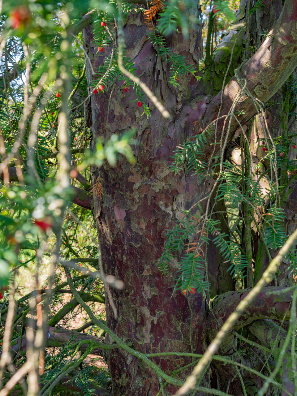 Usually large bush that grows into a small tree. Growth is slow, but the tree can eventually attain a height of approx. 15 - 20 m and a width of approx. 12 - 15 m. The crown is irregularly shaped. The short, brownish red trunk becomes thick and flakes off when the tree is old. Old branches hang down steeply and sometimes touch the ground. Young twigs are green. The needles are opposed on horizontally protruding twigs and spiral around vertically growing twigs. Striking fruit appears after unremarkable flowering: The seeds are covered 4/5 by an oval, fleshy, red case that is 0.6 – 0.7 cm long. Although the fleshy part of the fruit is not poisonous, the seeds and needles are. The plant is perfect for clipping into hedges or other shapes.
