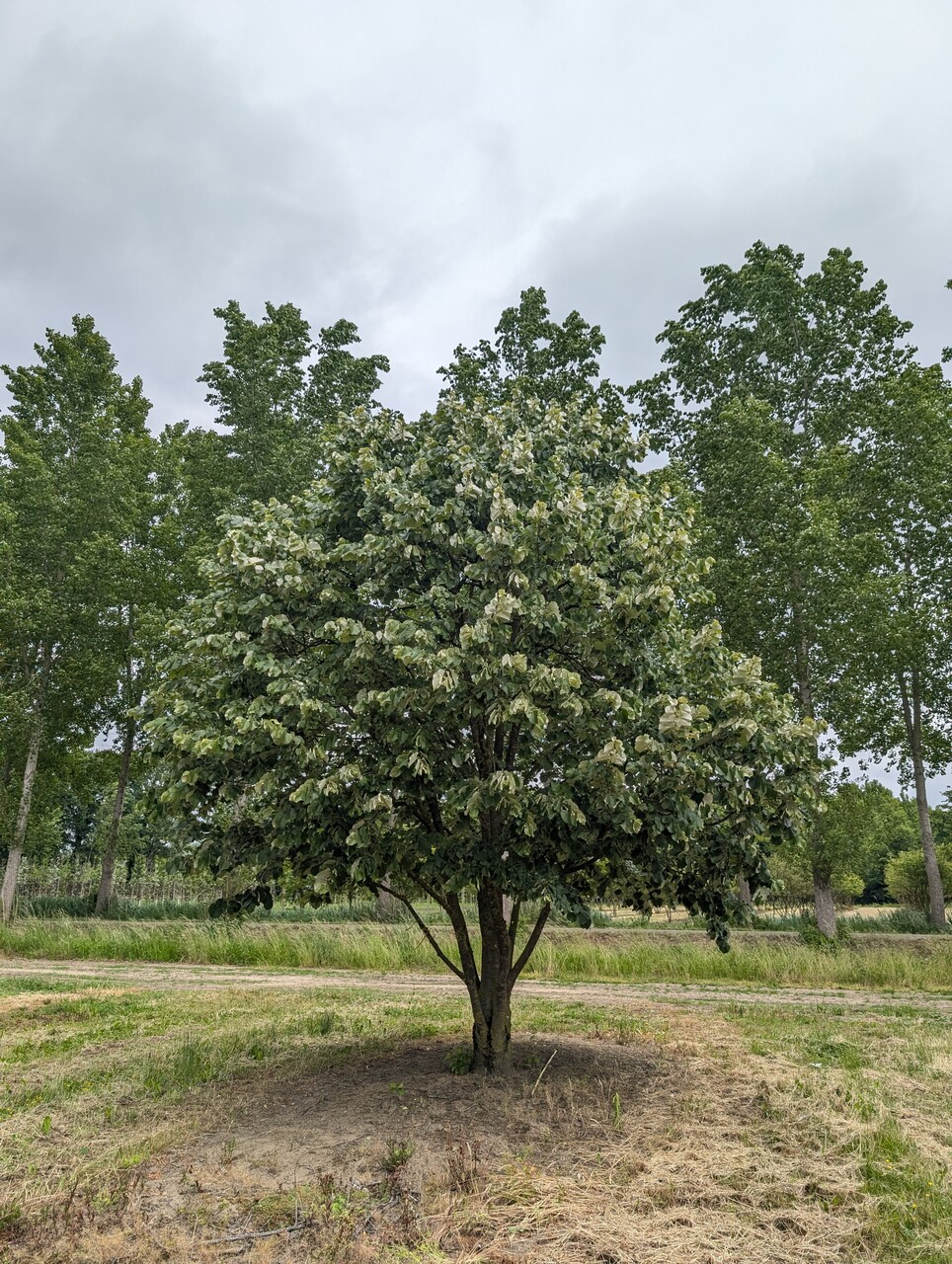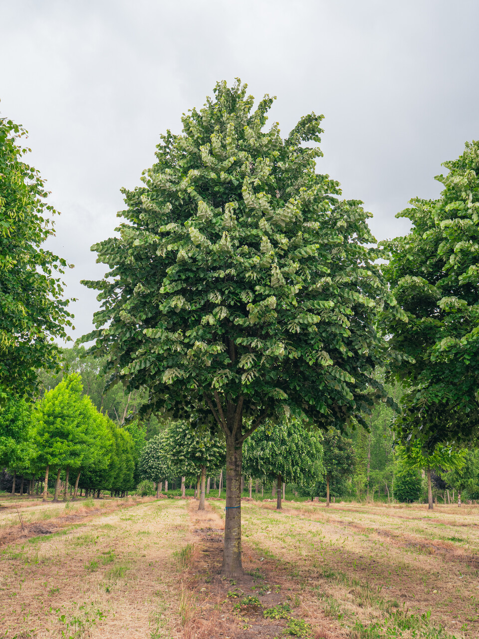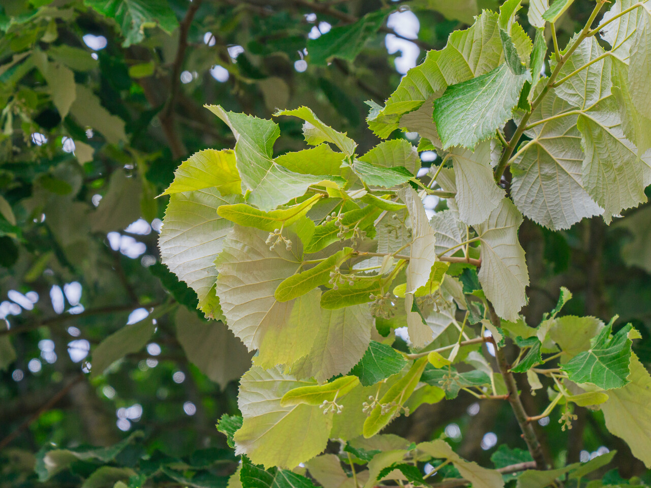 A Dutch cultivar with a tight, broadly conical crown with a pointed top. 'Brabant' has a good, straight main branch with upwards-slanting branches that are sturdier than those of the species. Height 20 - 25 m, width up to approx. 15 m. The smooth trunk is dark grey: young twigs are greenish grey and felt-like. The leaves are more or less round, dark matt green with a remarkably thick white felty underside. In the autumn they turn light yellow and stay on the tree for a long time. In July, pendulous umbels of strongly aromatic flowers appear. 'Brabant' is used often thanks to its uniform manner of growth. Fairly unsusceptible to aphids. Winter hardiness zone: 6a