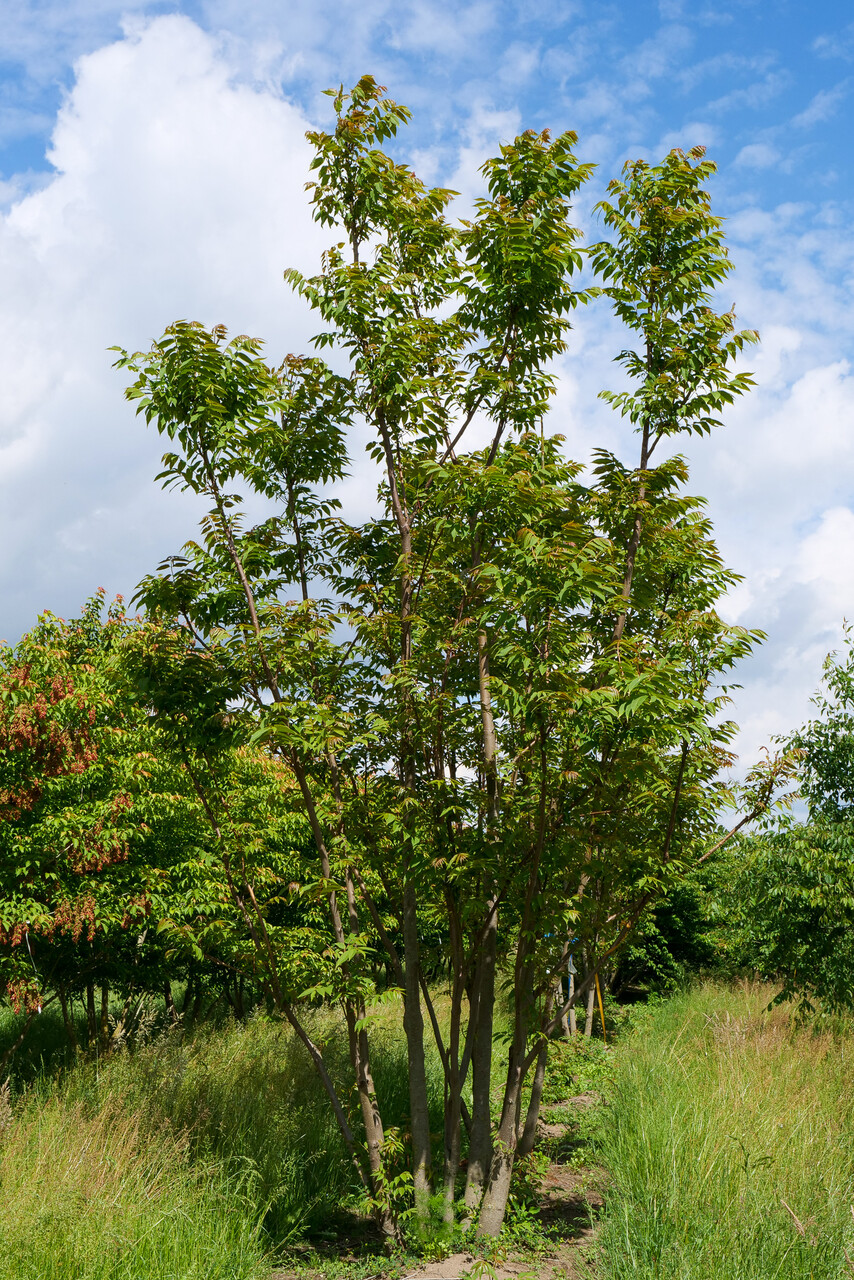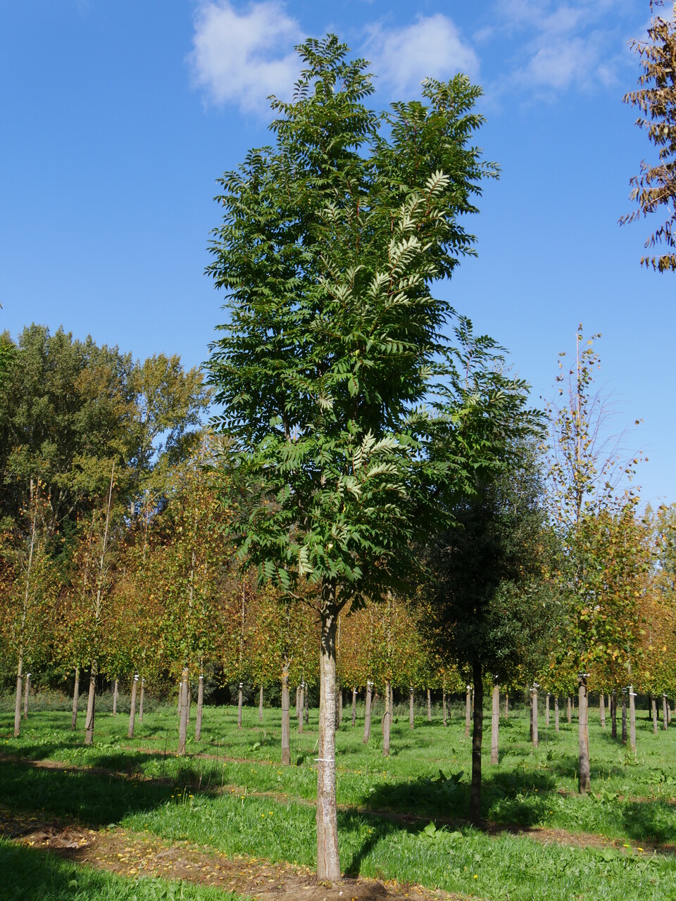 Particularly striking medium-size tree growing to 10 to 15 m. Initially the tree grows slenderly upwards and has a columnar crown. At a later stage the crown spreads. The young twigs are copper-coloured and hairy. The mature bark is grey-brown with longitudinal splits later. When damaged, the bark, branches and leaves smell unpleasant. The large, paripinnate leaf consists of 20 - 26 leaf segments. These are the same shape as the species. On emerging, they are intense orange-pink, turning greenish-yellow and eventually glossy, light green. In autumn the leaf turns yellow. The small, equally unpleasant smelling flowers appear in large panicles. After the blossom, woody capsules form containing winged seeds. The flowers and fruits only appear in hot summers. A special park tree or solitary.
