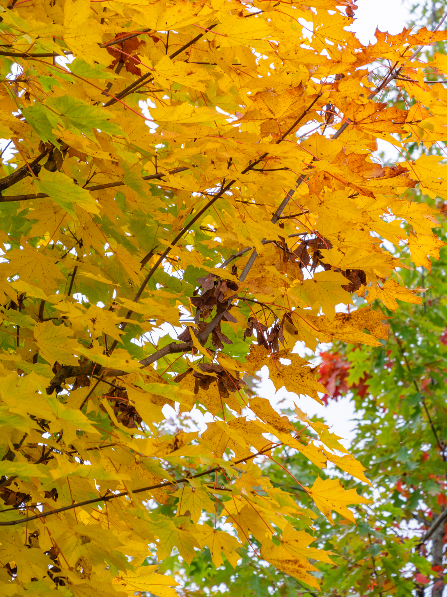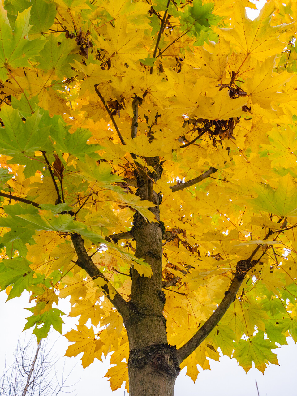 The leaves of Acer platanoides 'Columnare' turn sárga in autumn.