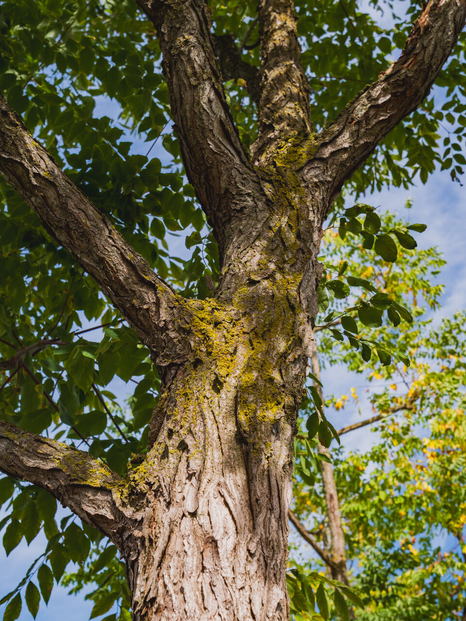 This medium to large tree has a loose, open crown consisting of thick main branches that have few side branches. The young twigs are rough and are covered with a grey to bluish-grey frosting. The sturdy thick trunk is dark grey, rough and deeply grooved. The leaves are very large, sometimes almost 1 m but usually about 70 cm in both length and width. The leaves are paripinnate and the separate leaf segments are ovoid and measure approx. 5 - 7 cm. In autumn the leaves turn yellow. The leaf stems remain hanging for some time after the leaves have been shed. The somewhat pendulous and dense flower plumes attain a length of approx. 25 cm. After flowering, hard leguminous fruit appears that can be up to 25 cm in length. The fruit turns brown as it ripens and remains hanging on the tree for a long time.