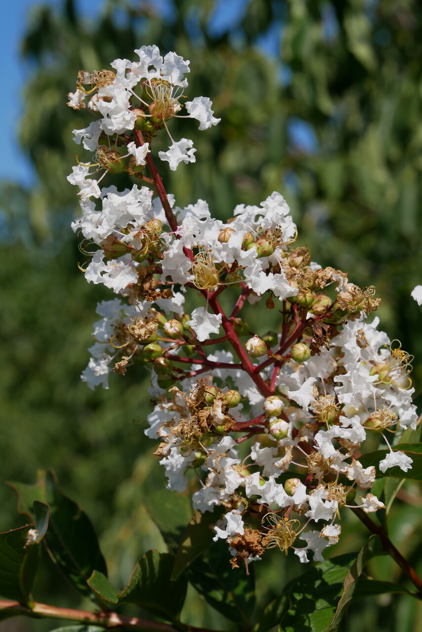 Lagerstroemia 'Natchez' blooms in július, augusztus.