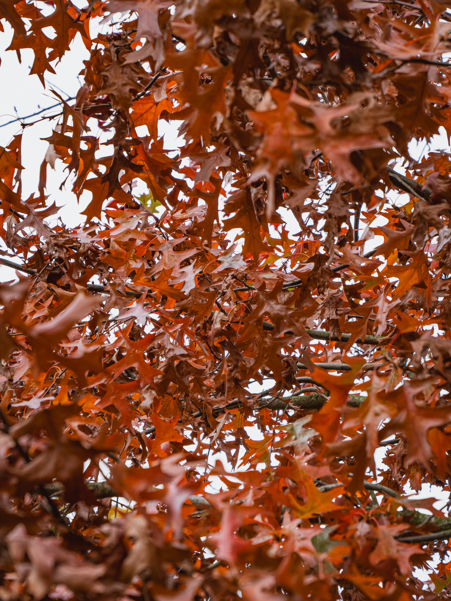 The leaves of Quercus palustris TREEVOLUTION® 'Woodside Splendor' turn piros in autumn.