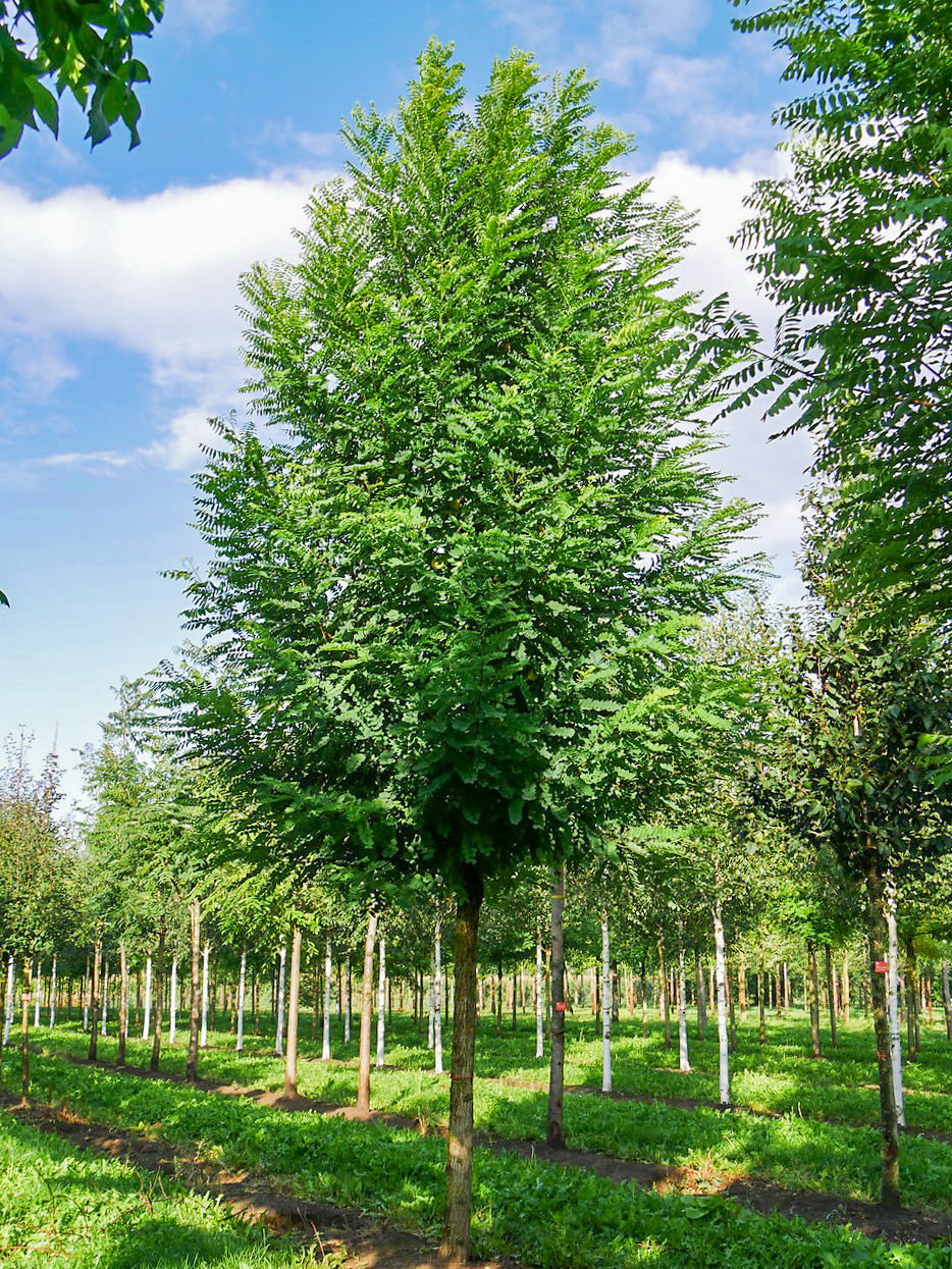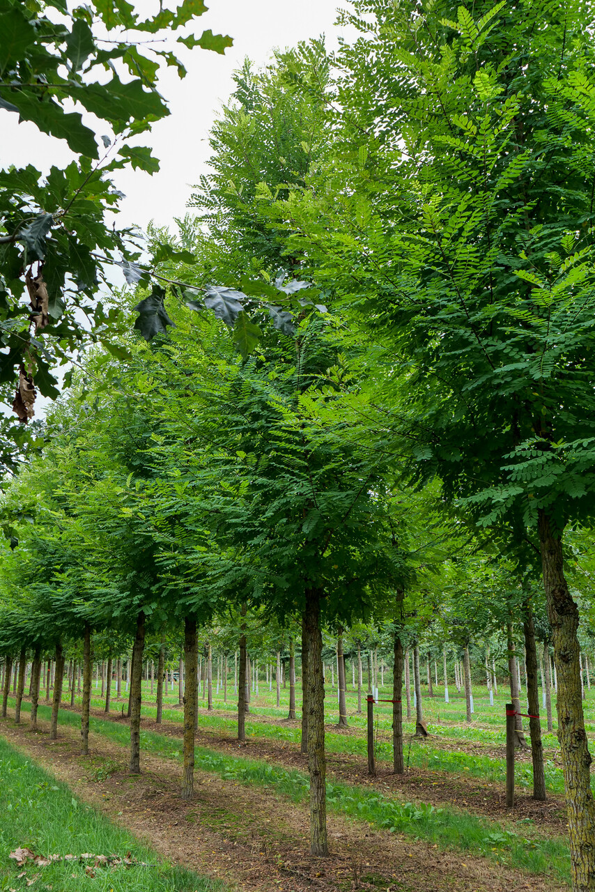 A decorative selection with a straight trunk and a broad, oval crown later becoming broad ovoid. The crown is significantly more closed in structure than that of the species. Height 15 - 20 m. The greyish brown bark is deeply grooved and the twigs have practically no thorns. The leaves are the same as those of the species. 'Bessoniana' blooms only rarely and the flowers are in more compact clusters than those of the species. The tree has a superficial root system and is somewhat sensitive to wind, but is less susceptible to branch breakage than the other cultivars are. Thanks to its irregular crown shape, 'Bessoniana' is a good street and avenue tree. Winter hardiness zone: 5a