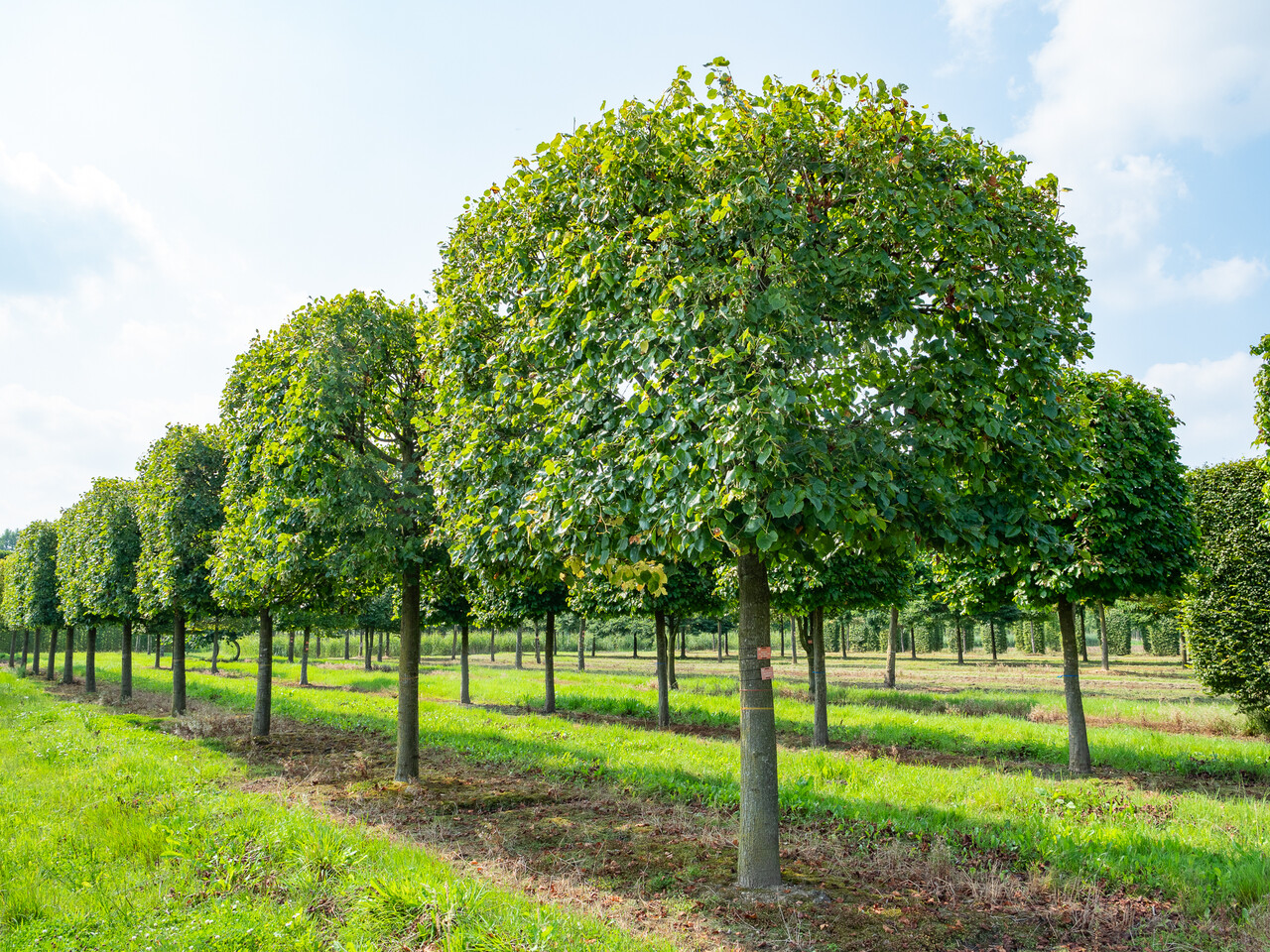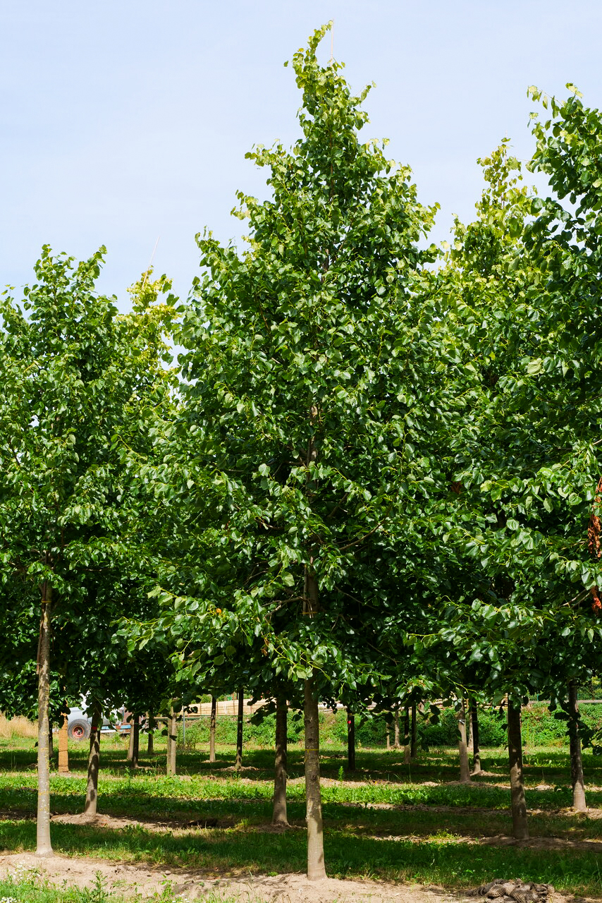 Very probably a hybrid between T. cordata and the rare T. dasystyla from the Crimean. Develops an oval crown with a vertical trunk on which pendulous branches grow. This makes good pruning necessary to guide the tree in its youth. The bark remains thin for a long time, and later develops deep grooves. The leaves have a slanted heart-shaped base and a short, tapered top. The leaf stem is often tinted red and the edge of the leaves is finely serrated. The leaves are light green on the underside. The aromatic flowers appear in pendulous umbels and have particularly abundant honey. 'Euchlora' is one of the best trees for bees. The bract is approx. 6.5 cm long. Owing to its lovely leaves and abundant flowers, 'Euchlora' is a very popular avenue and street tree. A big advantage is that it is not very prone to aphid infestation.